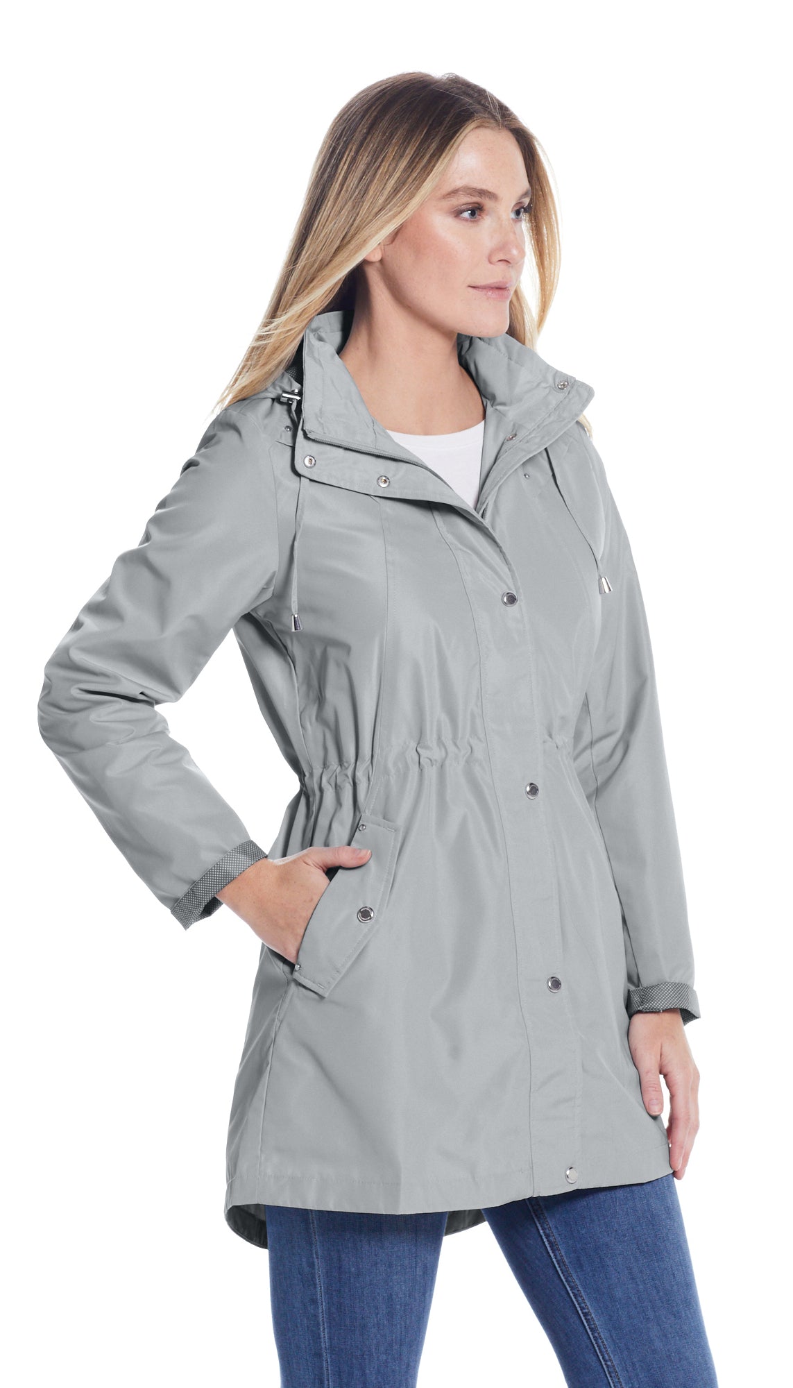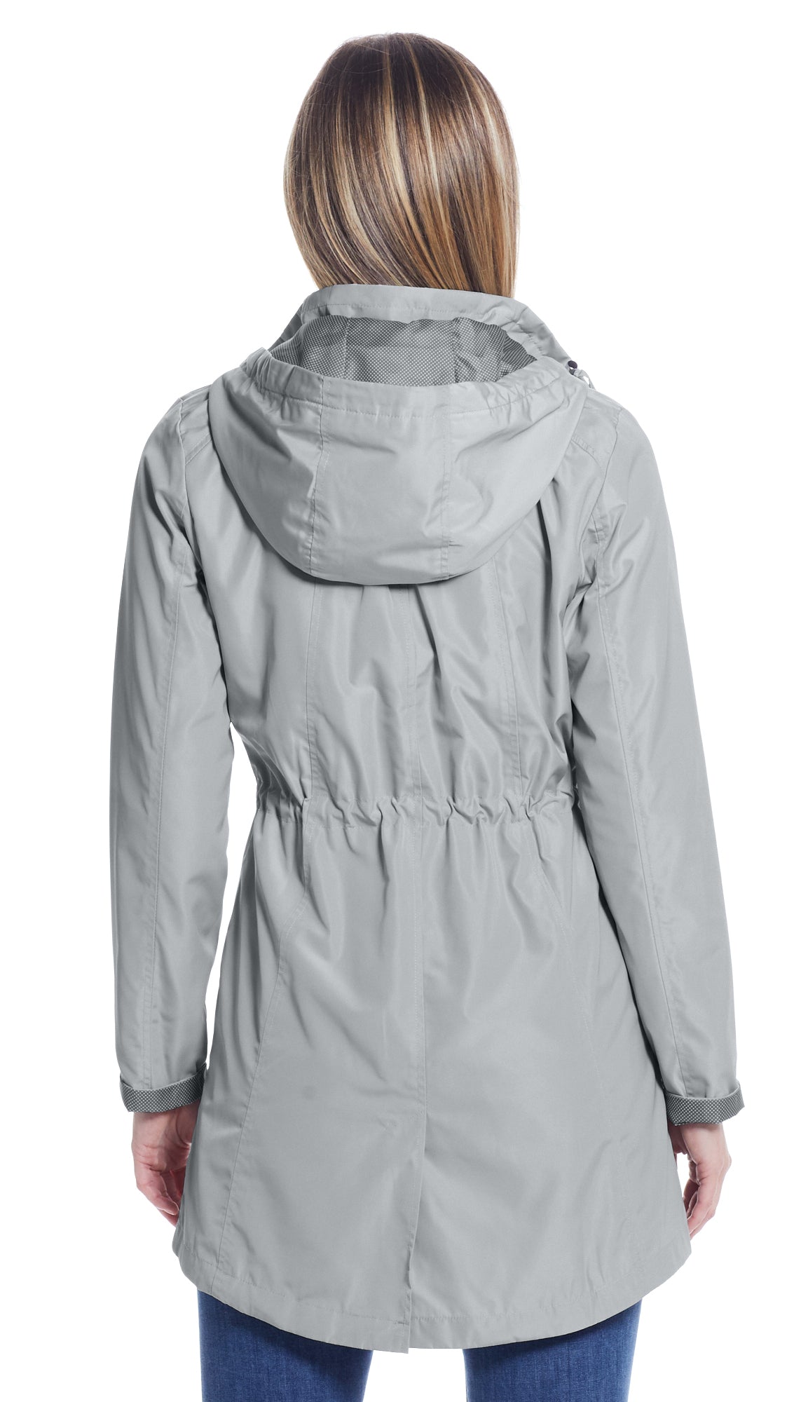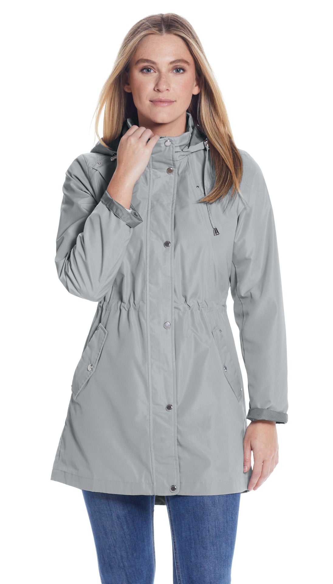 The Perfect Spring Essential! This Hooded Anorak combines a classic and sporty look with a Feminine Printed Polka Dot Lining with a turn back sleeve option and a slight HI/LOW hemline.