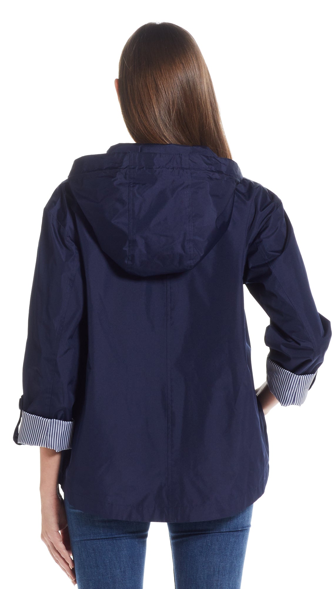 The Perfect Modern Spring Jacket with Turn Back Sleeves. Sleek. Sporty and Casual. This Lightweight Jacket is perfect for any Weekend Activity Fun! This Hooded lightweight Jacket has a zip front and snap front closure. lined in the back yoke. rolled back sleeves option with a mini stripe lining. side entry way pockets. striped drawstring pulls and a curved hemline.